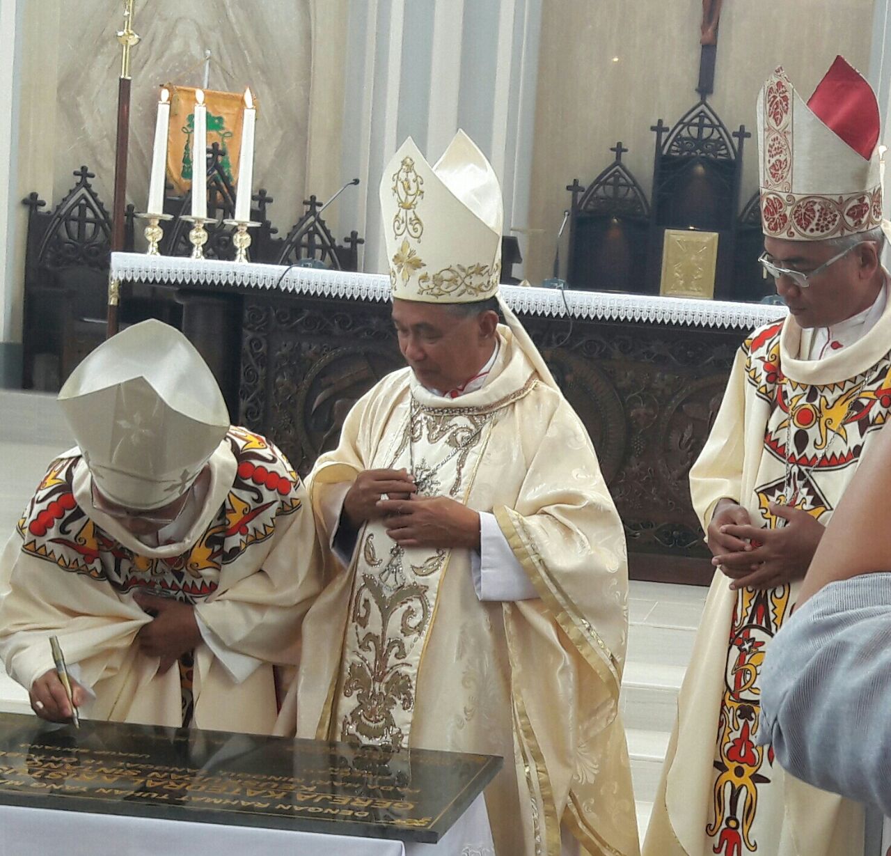 Gubernur Provinsi Kalimantan Barat Cornelis MH (keempat dari kanan) bersama isteri usai melakukan peresmian bangunan baru Gereja Kristus Raja – Katedral Sintang di Kalbar, Sabtu tanggal 14 Oktober 2017. (Ist)Bapak Uskup Keuskupan Sintang Mgr. Samuel Oton Sidin OFMCap membubuhkan tandatangannya di atas batu prasasti usai acara peresmian bersama Bapak Gubernur Provinsi Kalbar Cornelis MH (tengah) dan disaksikan oleh Bapak Uskup Agung Keuskupan Pontianak Mgr. Agustinus Agus. (Ist)Lukisan pada dinding langit-langit kubah gereja. (Ist)Ki-ka: Gubernur Provinsi Kalbar Cornelis MH, Uskup Keuskupan Sintang Mgr. Samuel Oton Sidin OFMCap, Uskup Agung Keuskupan Pontianak Mgr. Agustinus Agus. (Ist)Sudut-sudut bangunan gereja di lantai satu dan dua. (Ist)Bangunan baru Gereja Kristus Raja – Katedral Sintang di Provinsi Kalimantan Barat. (Ist)Bapak Uskup Agung Keuskupan Pontianak Mgr. Agustinus Agus –mantan Uskup Keuskupan Sintang dan Administrator Keuskupan Sintang– bersama Mgr. Pius Riana Prapdi dari Keuskupan Ketapang. (Ist)Bersama segenap umat dan imam di Keuskupan Sintang, Kalbar. (Ist)Bapak Uskup Keuskupan Sintang di Kalbar Mgr. Samuel Oton Sidin OFMCap membubuhkan tandatangannya disaksikan Mgr. Agustinus Agus dari Keuskupan Agung Pontianak dan Mgr. Pius Riana Prapdi dari Keuskupan Ketapang – Kalbar. (Ist)Altar utama Gereja Kristus Raja Katedral Sintang, Kalbar. (Ist)Sudut-sudut lantai satu bangunan Gereja Kristus Raja – Katedral Sintang di Kalimantan Barat. (Ist)Ornamen khas budaya lokal.Mgr. Agustinus Agus tengah memberi homili saat misa pemberkatan bangunan Gereja Kristus Raja – Katedral Sintang. (Ist)