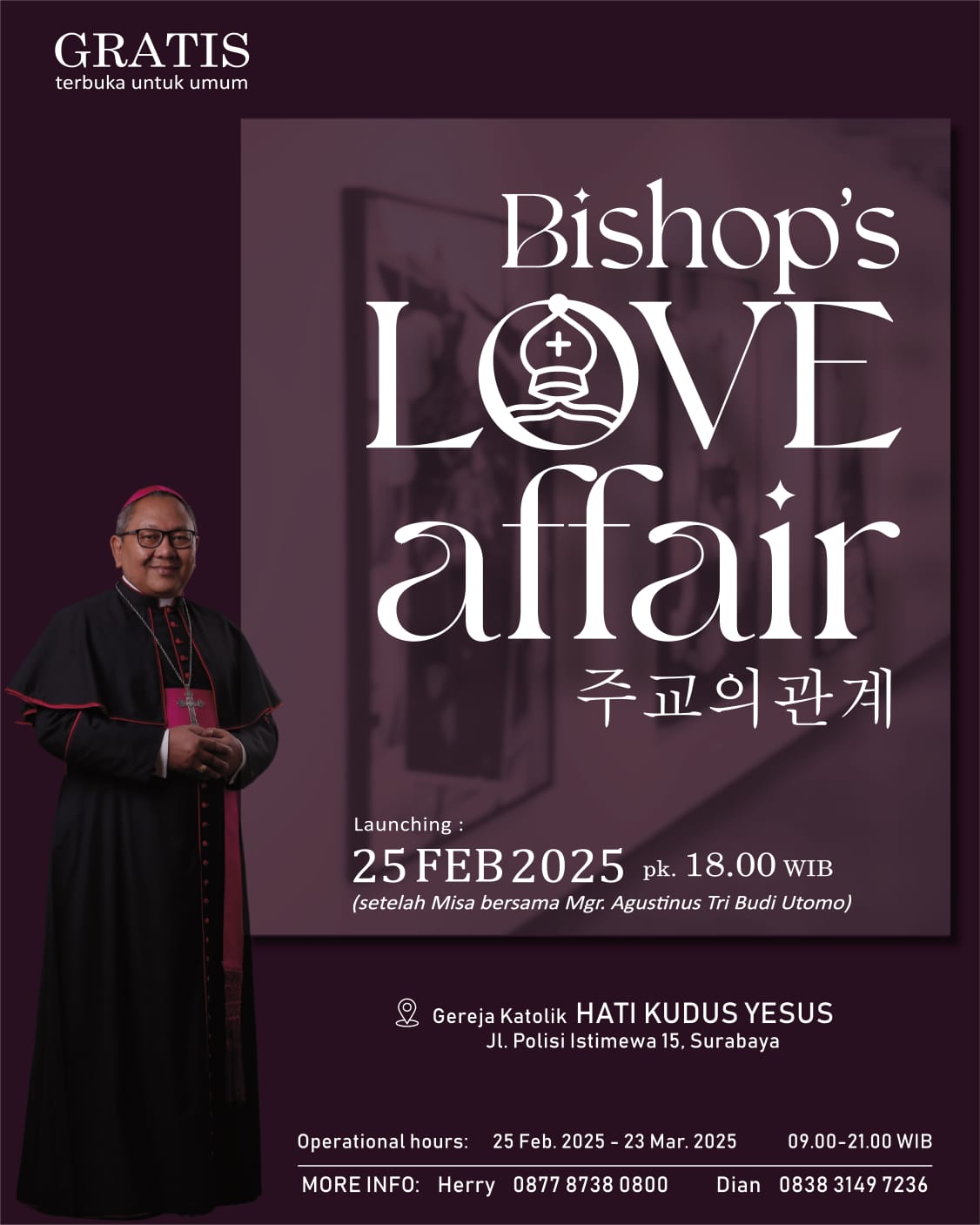 Pameran ini mengusung tema Bishop’s Love Affair menjadi yang pertama di kompleks Katedral Surabaya. Umat dan pengunjung diundang untuk menemukan serta menyelami berbagai ekspresi cinta Monsinyur Didik melalui karya-karyanya.
