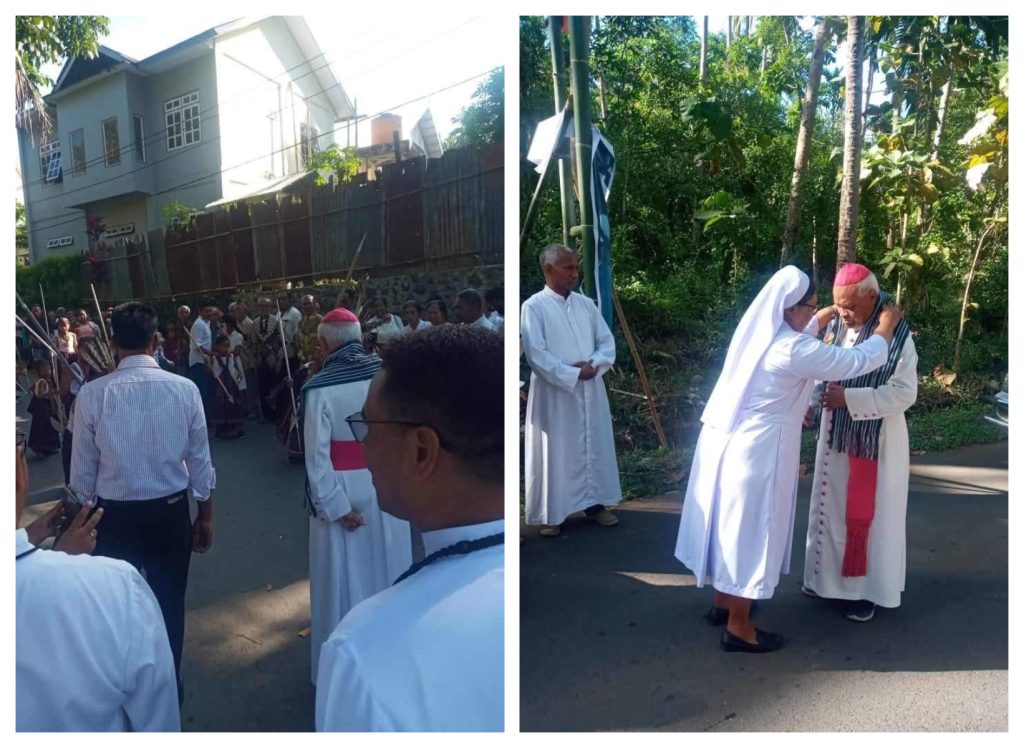 Kedatangan Bapak Uskup bersama rombongan dijemput oleh para peserta reuni bersama umat Paroki Lamabunga di depan gapura dan diiringi dengan tarian hedung oleh anak-anak remaja.