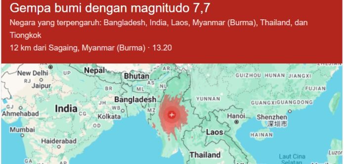 MYANMAR baru saja diguncang gempa bumi dahsyat berkekuatan 7,7 skala Richter. Terjadi hari Jumat hari ini tanggal 28 Maret 2025. Demikian laporan Survei Geologi Amerika Serikat (USGS) sebagaimana dirilis oleh media arus utama internasional.