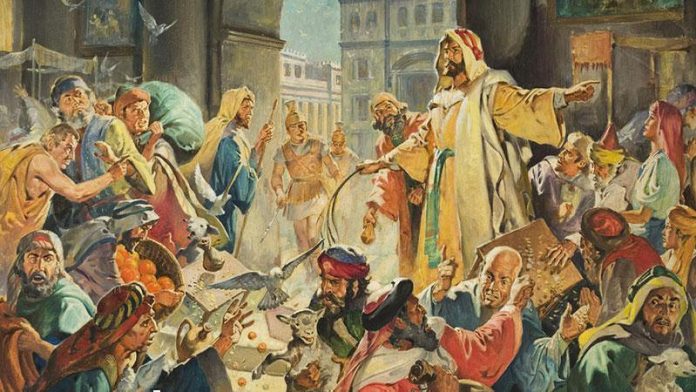 PAKAR: Yesus bukan tokoh agamaist fanatik yang kalap ngobrak-abrik usaha orang lain. “Unjuk rasa” itu kejadiannya begini. Dengan disaksikan banyak orang, Yesus bersama murid-muridnya sengaja datang ke serambi Bait Allah membawa dagangan dan meja penukar uang. Orang bertanya-tanya dalam hati apa guru terkenal ini mau bersaing dagang sapi, merpati, dan buka bisnis valas. Aneh, ia juga menjalin cemeti. Dan ketika rasa ingin tahu orang memuncak, ia tiba-tiba menjungkirbalikkan meja dagangan, mencambuki hewan yang dibawanya sendiri sambil menghardik murid-murid yang memainkan peran sebagai pedagang dan penukar uang: “Enyahlah, jangan bikin rumah Bapaku ini jadi pasar!” (ayat 16). Dan pada saat itu juga, masih termasuk pementasan ini, murid-murid berkomentar samping – gaya “aside” – mengutip Mzm 69:9(10), “Kalap sungguh aku oleh kobaran cintaku pada Bait-Mu!” Drama yang mementaskan tindakan simbolik selesai di sini. Tapi serambi yang morat-marit masih terlihat.