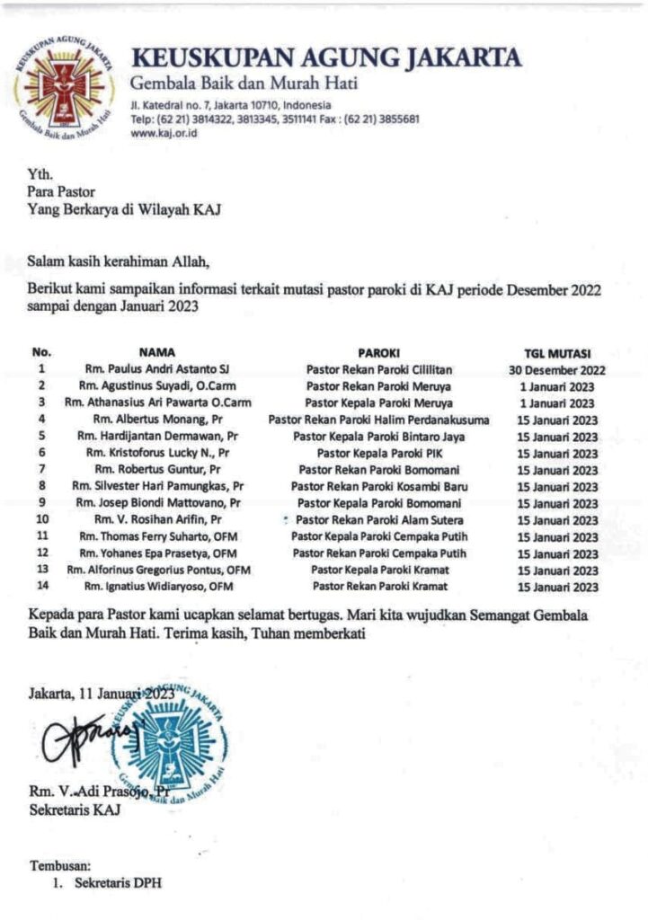 BERITADIREKTORIKeuskupan Januari 2023, Mutasi Tugas Para Imam di Keuskupan Agung Jakarta By Mathias Hariyadi - January 14, 2023 0 1,687 views Gereja Katedral Jakarta "Santa Maria Diangkat ke Surga" genap berumur 121 tahun (21 April 1901-2022) - Susyana Suwadie FacebookTwitterPinterestWhatsApp Mutasi Tugas Para Imam di Keuskupan Agung Jakarta mulai Januari 2023. (KAJ)