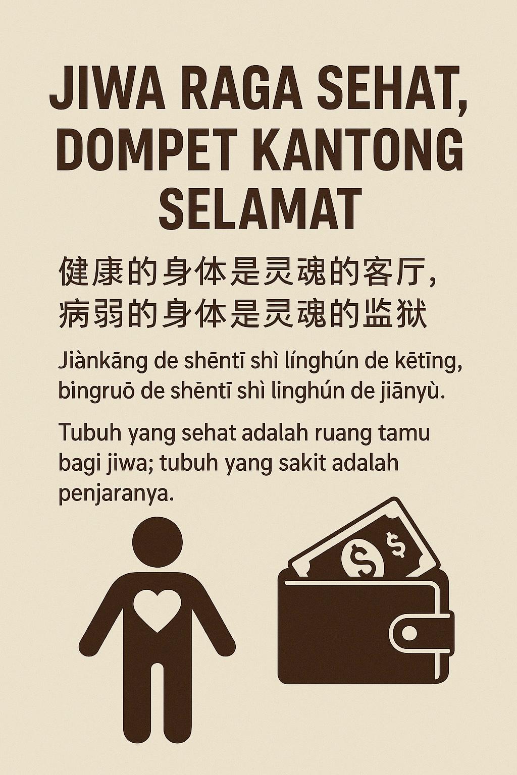 Kalau orang kerja keras sampai jatuh sakit, uangnya hanya habis buat berobat. Kantong bocor karena ‘jiwa raga sehat’ tak dijaga.