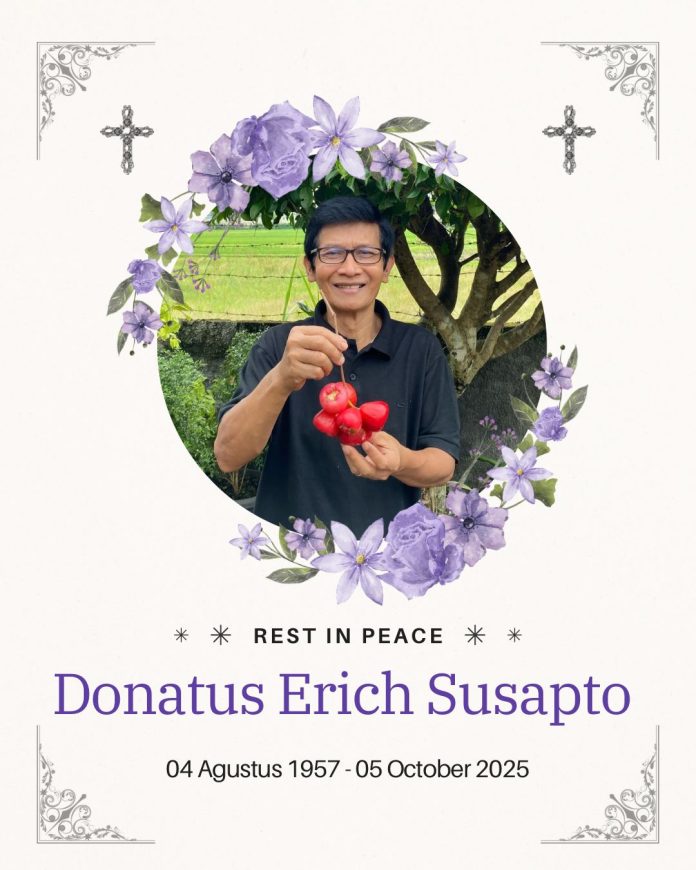 KABAR duka dari jaringan Ikatan Alumni Seminari Mertoyudan (IASM). Telah meninggal dunia di Jakarta, Minggu 5 Oktober pukul 23.38 WIB karena stroke: Donatus Erick Susapto (1957-2025).