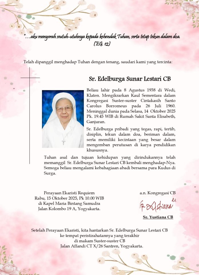 BERITA RIP Sr. Edelburga Sunar Lestari CB (87) Asal Paroki Wedi By Redaksi Sesawi.Net - October 15, 2025 0 0 views FacebookTwitterPinterestWhatsApp RIP Sr. Edelburga Sunar Lestari CB (87) asal Paroki Wedi. (CB) BERIKUT tautan misa requiem untuk almarhumah Sr. Edelburga Sunar Lestari CB (1938-2025).