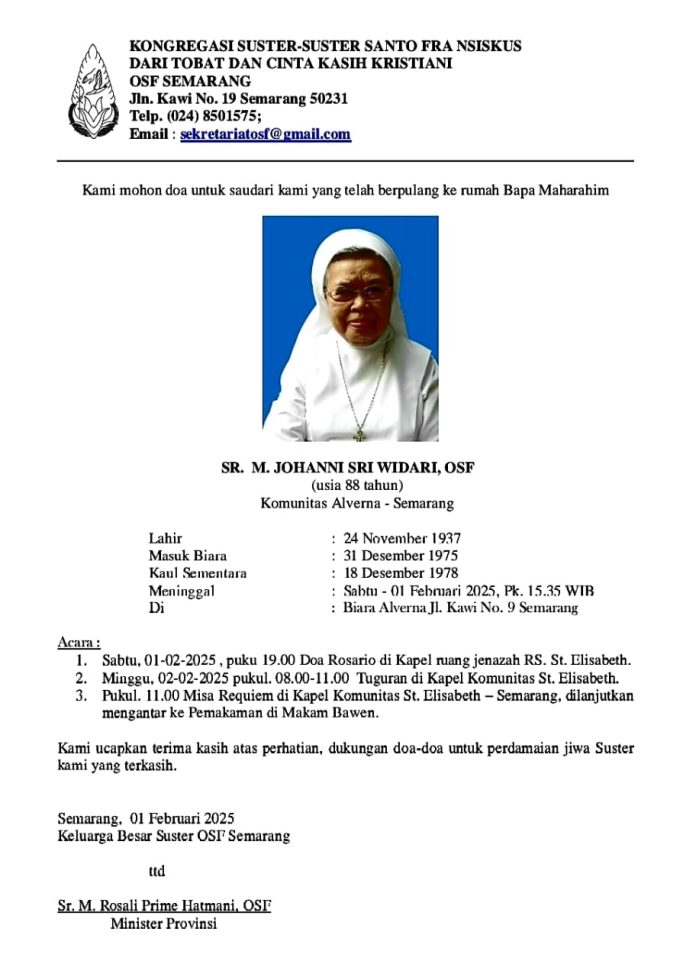 AGENDA PERISTIWABERITA RIP Sr. Johanni Sri Widari OSF (88) By FX Juli Pramana - February 1, 2025 0 123 views RIP Sr. Johanni Sri Widari OSF FacebookTwitterPinterestWhatsApp BERIKUT ini tautan misa requiem: