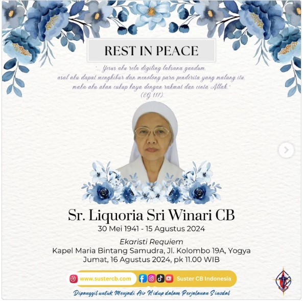 BERITA RIP Sr. Liquora Sri Winari CB By Mathias Hariyadi - August 16, 2024 0 75 views FacebookTwitterPinterestWhatsApp RIP Sr. Liquora Sri Winari CB