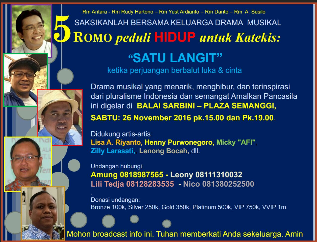 Mari dukung kiprah para katekis (guru agama) dengan menonton pergelaran seni drama musikal Satu Langit ini.